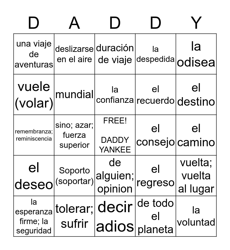 This bingo card has a free space and 24 words: Soporto (soportar), tolerar; sufrir, la confianza, la esperanza firme; la seguridad, la odisea, una viaje de aventuras, vuele (volar), deslizarse en el aire, el consejo, de alguien; opinion, el recuerdo, remembranza; reminiscencia, el regreso, vuelta; vuelta al lugar, mundial, de todo el planeta, el camino, duración de viaje, el destino, sino; azar; fuerza superior, la voluntad, el deseo, la despedida and decir adios.