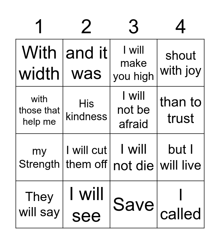 This bingo card has 40 words: Free!, His kindness, those who fear, I called, They will say, answer me, I will not be afraid, What will he do?, With width, I will see, To trust, than to trust, with those that help me, I will cut them off, to fall, helped me, surrounded me, and it was, for a salvation, shout with joy, my Strength, righteous ones, I will not die, but I will live, in the tents, He will punish me, open, gates, and I will tell over, They will come, The builders, a wonder, I will come, and we will be happy, Save, make successful, in our eyes, and He lit up, I will make you high and you are blessed.