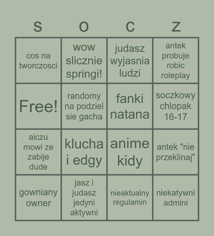 This bingo card has 16 words: jasz i judasz jedyni aktywni, antek "nie przeklinaj", judasz wyjasnia ludzi, cos na tworczosci, aiczu mowi ze zabije dude, wow slicznie springi!, anime kidy, nieaktualny regulamin, Free!, randomy na podziel sie gacha, gowniany owner, antek probuje robic roleplay, klucha i edgy, soczkowy chlopak 16-17, fanki natana and niekatywni admini.