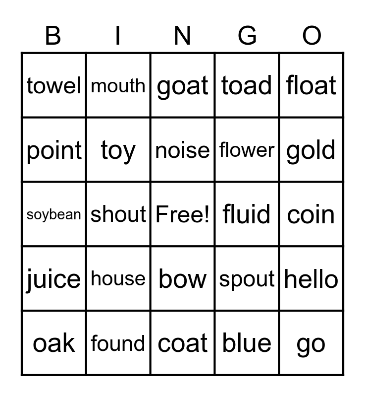 This bingo card has a free space and 24 words: house, found, noise, oak, float, towel, point, mouth, fluid, bow, flower, soybean, spout, hello, toy, blue, coin, goat, gold, shout, go, juice, toad and coat.