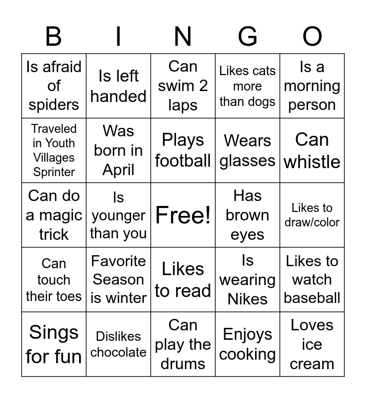 This bingo card has a free space and 24 words: Favorite Season is winter, Dislikes chocolate, Plays football, Sings for fun, Is a morning person, Is afraid of spiders, Traveled in Youth Villages Sprinter, Is left handed, Has brown eyes, Likes to read, Wears glasses, Can do a magic trick, Is wearing Nikes, Likes to watch baseball, Was born in April, Enjoys cooking, Likes to draw/color, Can swim 2 laps, Can whistle, Is younger than you, Loves ice cream, Can touch their toes, Likes cats more than dogs and Can play the drums.