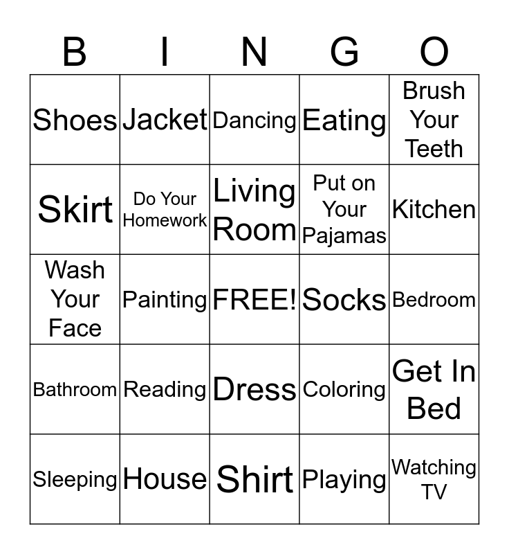 This bingo card has a free space and 24 words: Reading, House, Living Room, Sleeping, Brush Your Teeth, Shoes, Skirt, Jacket, Socks, Dress, Put on Your Pajamas, Wash Your Face, Coloring, Get In Bed, Do Your Homework, Playing, Bedroom, Dancing, Kitchen, Painting, Watching TV, Bathroom, Eating and Shirt.