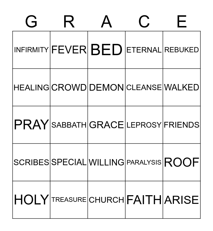 This bingo card has a free space and 24 words: SPECIAL, TREASURE, DEMON, HOLY, REBUKED, INFIRMITY, HEALING, FEVER, LEPROSY, WILLING, CLEANSE, PRAY, PARALYSIS, ROOF, CROWD, FAITH, FRIENDS, BED, WALKED, SABBATH, ARISE, SCRIBES, ETERNAL and CHURCH.