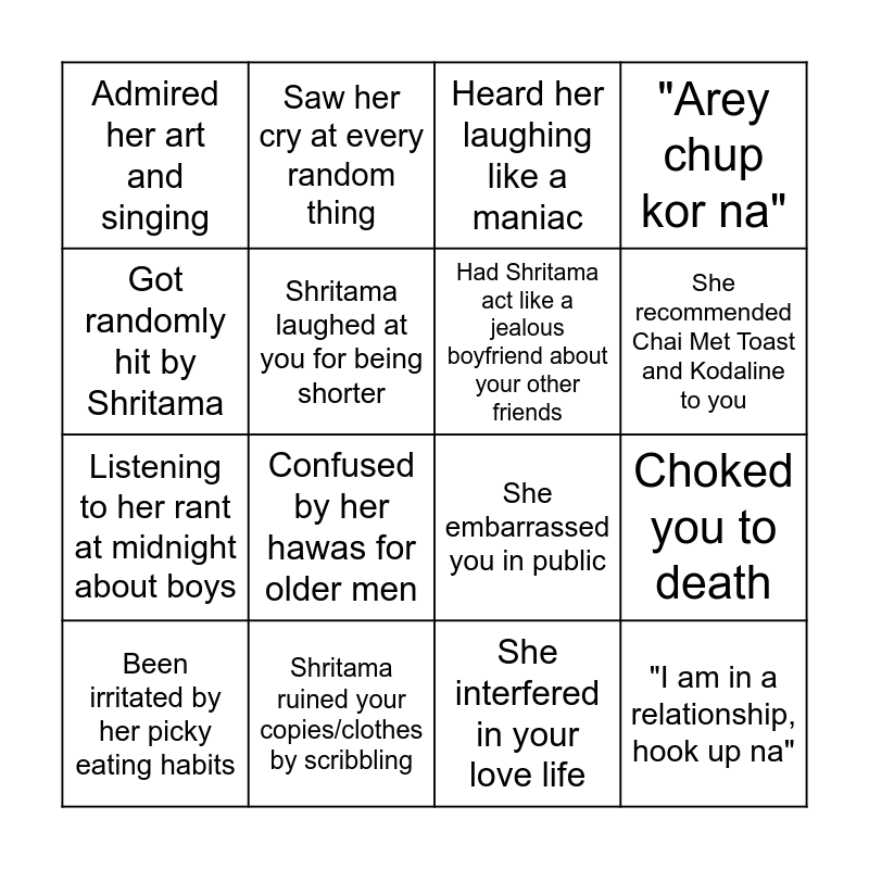 This bingo card has 16 words: Shritama ruined your copies/clothes by scribbling, Choked you to death, Heard her laughing like a maniac, Admired her art and singing, Listening to her rant at midnight about boys, Saw her cry at every random thing, She embarrassed you in public, She interfered in your love life, Got randomly hit by Shritama, Shritama laughed at you for being shorter, Been irritated by her picky eating habits, "Arey chup kor na", Confused by her hawas for older men, She recommended Chai Met Toast and Kodaline to you, Had Shritama act like a jealous boyfriend about your other friends and "I am in a relationship, hook up na".