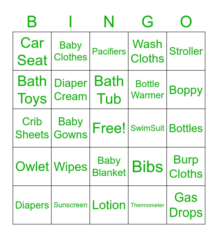 This bingo card has a free space and 25 words: Wipes, Lotion, Bath Tub, Diapers, Stroller, Car Seat, Bath Toys, Baby Clothes, SwimSuit, Baby Blanket, Bottle Warmer, Crib Sheets, Bibs, Burp Cloths, Diaper Cream, Hooded Towel, Bottles, Pacifiers, Boppy, Baby Gowns, Gas Drops, Sunscreen, Owlet, Wash Cloths and Thermometer.