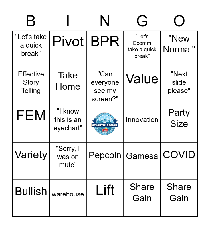 This bingo card has a free space and 24 words: "Sorry, I was on mute", warehouse, "Can everyone see my screen?", Bullish, "New Normal", "Let's take a quick break", Effective Story Telling, Pivot, Innovation, Pepcoin, Value, FEM, Gamesa, COVID, Take Home, Share Gain, Party Size, BPR, "Next slide please", "I know this is an eyechart", Share Gain, Variety, "Let's Ecomm take a quick break" and Lift.