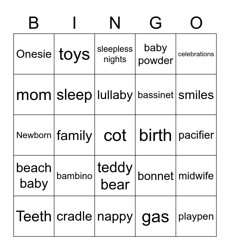 This bingo card has a free space and 54 words: Baby daddy, beach baby, blankie, high chair, teddy bear, changing pad, baby powder, Girl, mom, baby monitor, Onesie, pram, cradle, Teeth, diapers, nappy, playpen, bassinet, bouncy seat, pacifier, bonnet, mittens, birth, celebrations, rattle, toys, baby carrier, spit up, creche, gas, explosions, dummy, nursery, tantrum, sleepless nights, wind, Newborn, midwife, push chair, sleep, parents, due date, Formula, Toddler, bambino, Bottle, nursery rhymes, bath time, lullaby, family, smiles, car seat, milk and love.