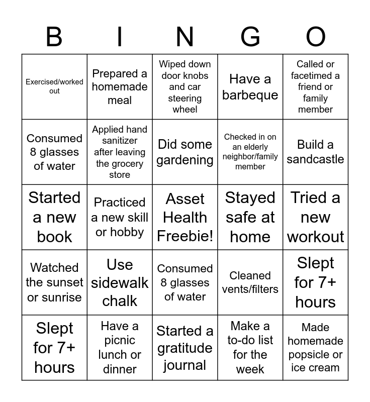 This bingo card has a free space and 99 words: Washed hands after going into a business, Wore mask during a visit into a business, Applied hand sanitizer after leaving the grocery store, Wiped down door knobs and car steering wheel, Washed hands first thing when entering your home, Virtual “Happy hour” with family/friends, Stayed safe at home, Called or facetimed a friend or family member, Sent a greeting card in the mail to a friend or a family member, Checked in on an elderly neighbor/family member, Trickster app (or similar) for playing cards with friends/family, Consumed 3 servings of fruit daily, 3x a week, Consumed 2 servings of vegetables, 3x a week, Consumed 8 glasses of water, Go for a walk while on a call or in a meeting, Exercised/worked out, Prepared a homemade meal, Tried a new workout, Family walk after dinner, Bike ride on a new trail, Harvest garden vegetables, Jump rope, Played Tennis, Went Swimming, Meditated, Slept for 7+ hours, Did some gardening, Cut down on social media, Cut down on news consumption, Mix up your routine by working outside, Started a gratitude journal, Make a to-do list for the week, Made time for myself, Put phone on silent, Practiced a new skill or hobby, Started a new book, Family water balloon fight, Went Kayaking or canoeing, Watched the sunset or sunrise, Use sidewalk chalk, Chase fireflies, Build a sandcastle, Have a barbeque, Have a picnic lunch or dinner, Run through a sprinkler, Make homemade popsicle or ice cream, Fire extinguisher in the home, Escape plan in case of emergencies, CO2 detector/fire alarms, Cleaning vents/filters, Prevent slips/trips/falls – check rugs/carpets, cords etc., Made homemade popsicle or ice cream, Cleaned vents/filters, Used sidewalk chalk, Built a sandcastle, Ran through a sprinkler, Rode my bike on a new trail, Jumped roped, Went Swimming, Cut down on social media, Did some gardening, Had a picnic lunch or dinner, Played Tennis, Harvested garden vegetables, Washed hands after going into a business, Called or facetimed a friend or family member, Checked CO2 detector/fire alarms, Had a barbeque, Prevent slips/trips/falls – checked rugs/carpets, cords etc., Watched the sunset or sunrise, Meditated, Checked in on an elderly neighbor/family member, Consumed 8 glasses of water, Cut down on news consumption, Practiced a new skill or hobby, Wore mask during a visit into a business, Applied hand sanitizer after leaving the grocery store, Wiped down door handle and car steering wheel, Washed hands first thing when returning home, Attended Virtual “Happy hour” with family/friends, Stayed safe at home, Sent a greeting card in the mail to a friend or a family member, Used Trickster app (or similar) for playing cards with friends/family, Consumed 3 servings of fruit daily, 3x a week, Consumed 2 servings of vegetables, 3x a week, Went for a walk (while a call or in a meeting or after a meal), Exercised/worked out (Aerobic or weightlifting session), Prepared a homemade meal, Tried a new workout, Slept for 7+ hours, Mixed up your routine by working outside, Started a gratitude journal, Made a to-do list for the week, Made time for self, Put phone on silent, Started a new book, Went Kayaking or canoeing, Chased fireflies and Identified or placed a fire extinguisher in the home.