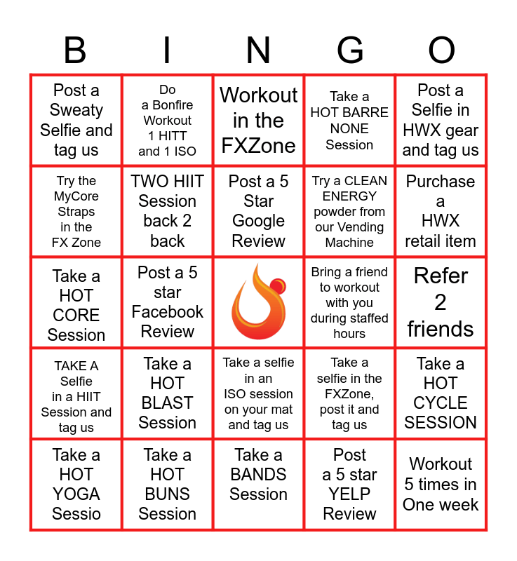 This bingo card has a free space and 24 words: Take a HOT BLAST Session, Take a HOT BUNS Session, Post a 5 Star Google Review, Take a HOT YOGA Sessio, Post a Selfie in HWX gear and tag us, Post a Sweaty Selfie and tag us, Try the MyCore Straps in the FX Zone, Do a Bonfire Workout 1 HITT and 1 ISO, Bring a friend to workout with you during staffed hours, Take a selfie in an ISO session on your mat and tag us, Try a CLEAN ENERGY powder from our Vending Machine, Take a HOT CORE Session, Take a selfie in the FXZone, post it and tag us, Take a HOT CYCLE SESSION, TWO HIIT Session back 2 back, Post a 5 star YELP Review, Refer 2 friends, Workout in the FXZone, Purchase a HWX retail item, Post a 5 star Facebook Review, Workout 5 times in One week, TAKE A Selfie in a HIIT Session and tag us, Take a HOT BARRE NONE Session and Take a BANDS Session.