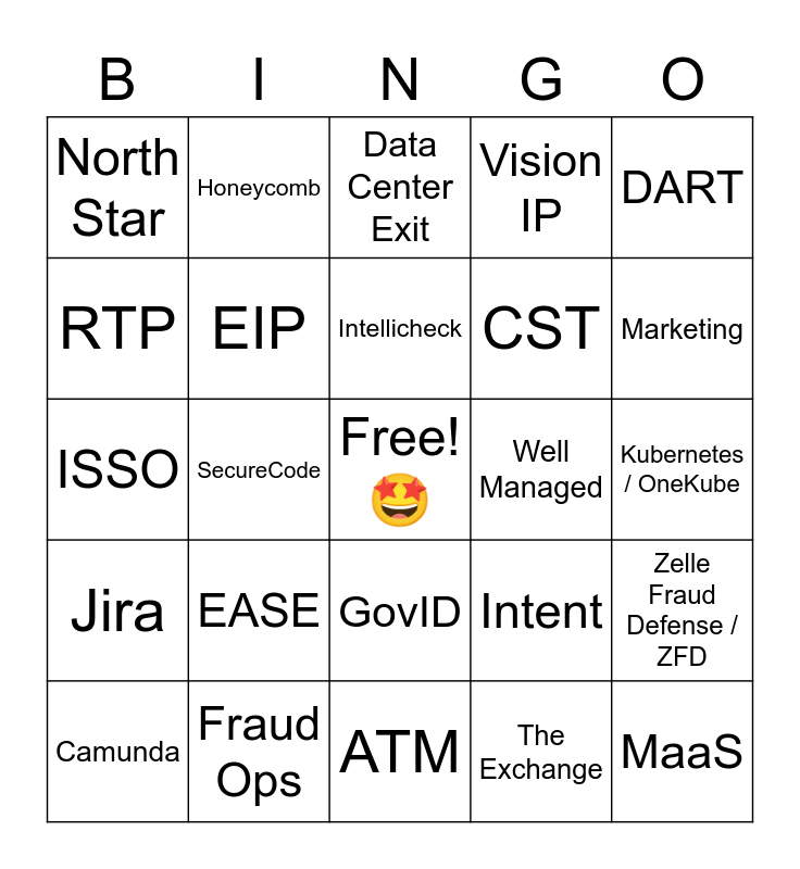 This bingo card has a free space and 92 words: ACH, Aegis, ATM, ATOM, Authentication, Bill Pay, Branch / Cafe, Camunda, Case Mgmt, Coffee, Confluence, Connections, CPAL, CST, CuRE, DART, Data Center Exit, Data Science, Data Transformation, Datadog, OneDash, Debit, Defender, E4A, EASE, EIP, EWS, FAML, Feature Platform, Fraud Graph / GraphDB, Fraud Ops, GovID, Gumbo, Hodor, Honeycomb, Identity Builder, In-Branch Authentication, Inclearing, Intellicheck, Intent, ISSO, Jira, Kubernetes / OneKube, Limits Engine, MaaS, Machine Learning, Messaging, NRT, OneIngest / SDP, OneLake, OnePipeline, Pega, PEP+, PIE, Profile (Bank SOR), Ra, RaaS, RTP, SASSy, SecureCode, ShAirflow, Snowflake, Splunk, Step Up, Systematics (Bank SOR), The Exchange, Account Hub, Transactions Hub, AI, Strategy, Transite, Verification, Vision IP, Wire Watch, Wires, Zelle, Zelle Fraud Defense / ZFD, Zoom, You're on Mute, Can you hear me?, Next Slide, Well Managed, North Star, Ontology, Card Not Present, OTP, Legacy, Destination, Kahoot, Chatbot, Marketing and Change Banking for Good.