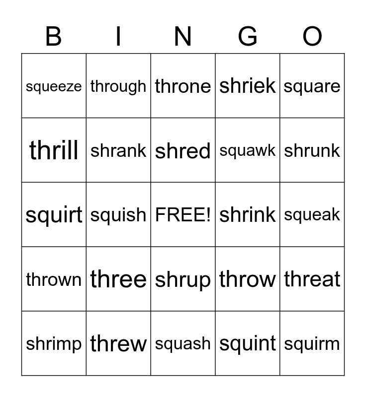 This bingo card has a free space and 24 words: three, threw, shred, shrimp, square, squeeze, thrill, through, shrink, shrup, squawk, squirt, throw, threat, shrank, squint, squeak, throne, shrunk, squish, squirm, thrown, shriek and squash.
