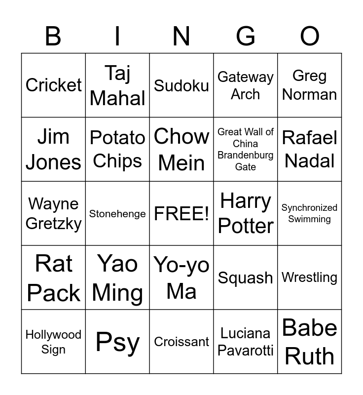 This bingo card has a free space and 72 words: Washington Monument, Taj Mahal, Stonehenge, Colosseum, Sydney Opera House Eiffel Tower, Machu Picchu, Gateway Arch, Great Pyramid of Giza, Great Wall of China Brandenburg Gate, Big Ben, Hollywood Sign, Leaning Tower of Pisa Mount Rushmore, Rafael Nadal, Cricket, Bocce, Wayne Gretzky, Squash, Greg Norman, Shawn Johnson, Synchronized Swimming, Yao Ming, Babe Ruth, Wrestling, Lacrosse, Polo, Bobsledding, Cross Country, Bono, Salvador Dali, Cassius Clay, Psy, Sigmund Freud, Nelson Mandela, Robert Oppenheimer, Luciana Pavarotti, John D. Rockafeller, Pele, Simon Bolivar, Jim Jones, Mata Hari, Yo-yo Ma, Imhotep, Macarena, Sixth Sense, Pokemon, Rat Pack, Mickey Mantle, Beatles, Saturday Night Live, Scrunchie, Y2K, American Idol, Dolly, Harry Potter, Magic 8-Ball, Dikembe Mutombo, Sudoku, Chow Mein, Hummus, Kosher, Phyllo Dough, Paella, Tofu, Croissant, Kebab, PEZ, Potato Chips, Popsicle, Goulash, Falafel, Gelato and Gazpacho.