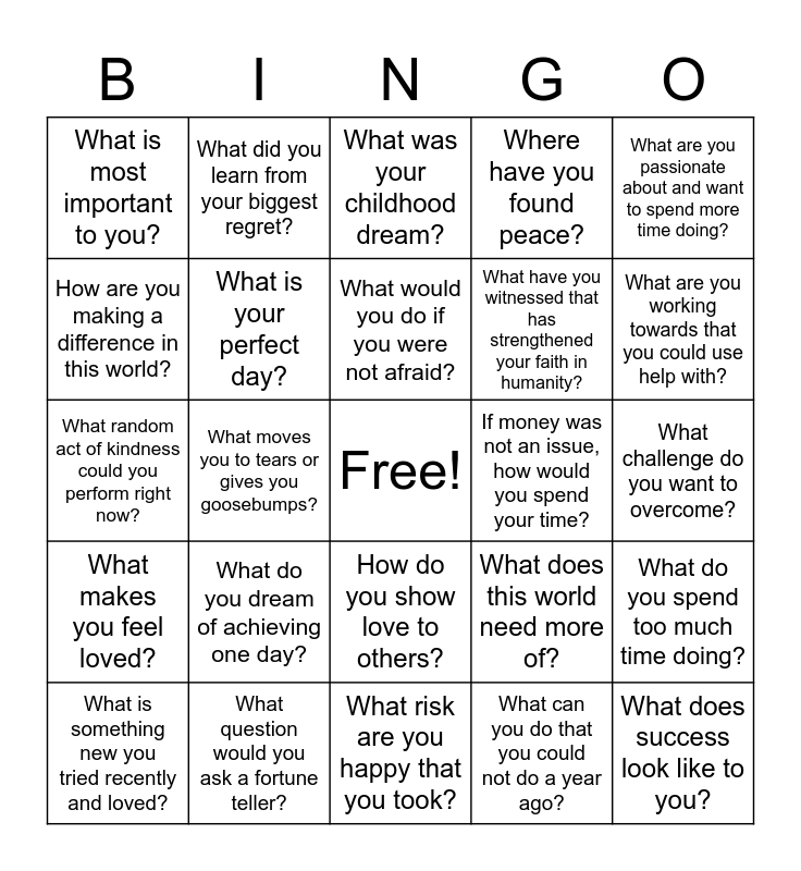 This bingo card has a free space and 29 words: What is something new you tried recently and loved?, What makes you lose track of time?, What moves you to tears or gives you goosebumps?, What is a defining moment in your life and how did it impact you?, What is most important to you?, What was your childhood dream?, What is your perfect day?, What do you dream of achieving one day?, If money was not an issue, how would you spend your time?, What question would you ask a fortune teller?, What challenge do you want to overcome?, What does success look like to you?, What risk are you happy that you took?, What can you do that you could not do a year ago?, What are you working towards that you could use help with?, What is one of the kindest things someone has ever done for you?, How do you show love to others?, What makes you feel loved?, What are you passionate about and want to spend more time doing?, What random act of kindness could you perform right now?, What does this world need more of?, Who are your heroes?, What have you witnessed that has strengthened your faith in humanity?, How are you making a difference in this world?, Where have you found peace?, What did you learn from your biggest regret?, What do you spend too much time doing?, What would you do if you were not afraid? and What do you want to let go of?.