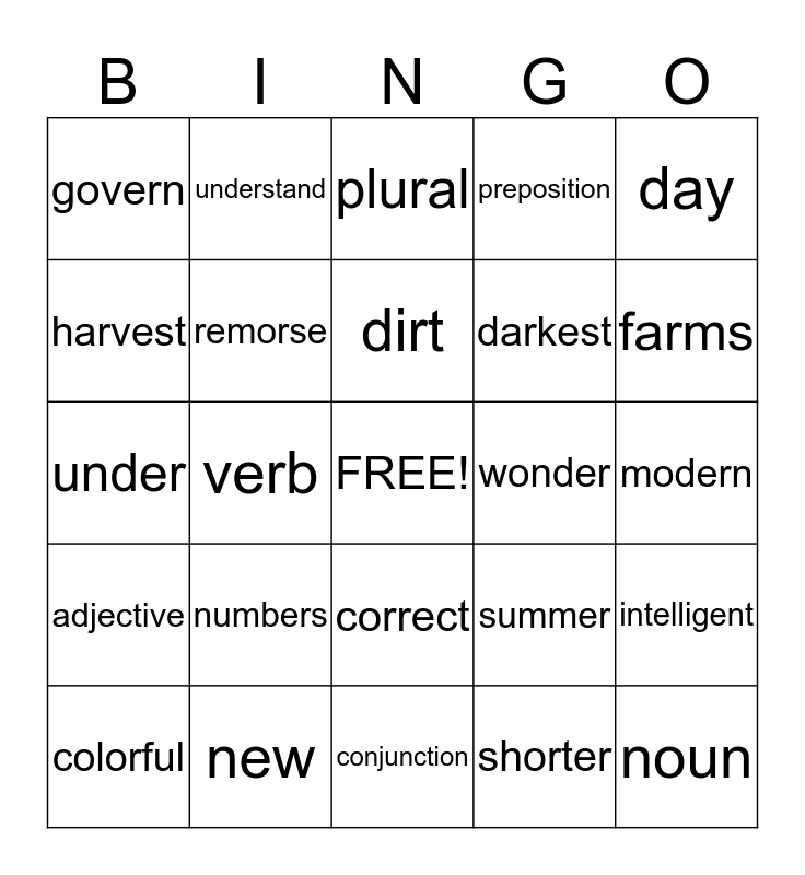 This bingo card has a free space and 24 words: numbers, new, dirt, colorful, day, govern, harvest, understand, wonder, correct, darkest, under, summer, intelligent, remorse, shorter, modern, plural, farms, verb, noun, adjective, preposition and conjunction.