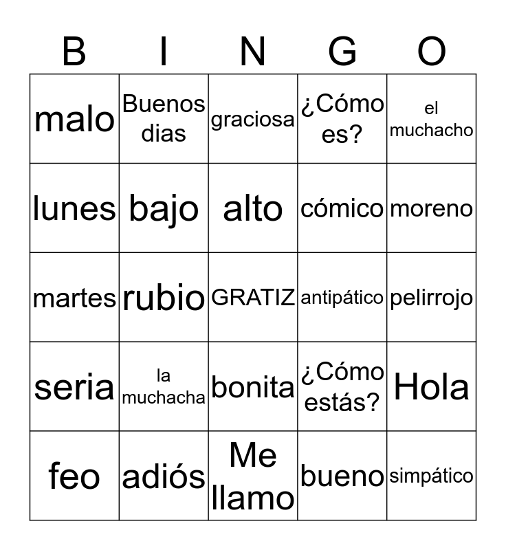 This bingo card has a free space and 24 words: la muchacha, adiós, alto, feo, el muchacho, malo, lunes, Buenos dias, antipático, bonita, cómico, martes, ¿Cómo estás?, Hola, bajo, bueno, pelirrojo, graciosa, moreno, rubio, simpático, seria, ¿Cómo es? and Me llamo.