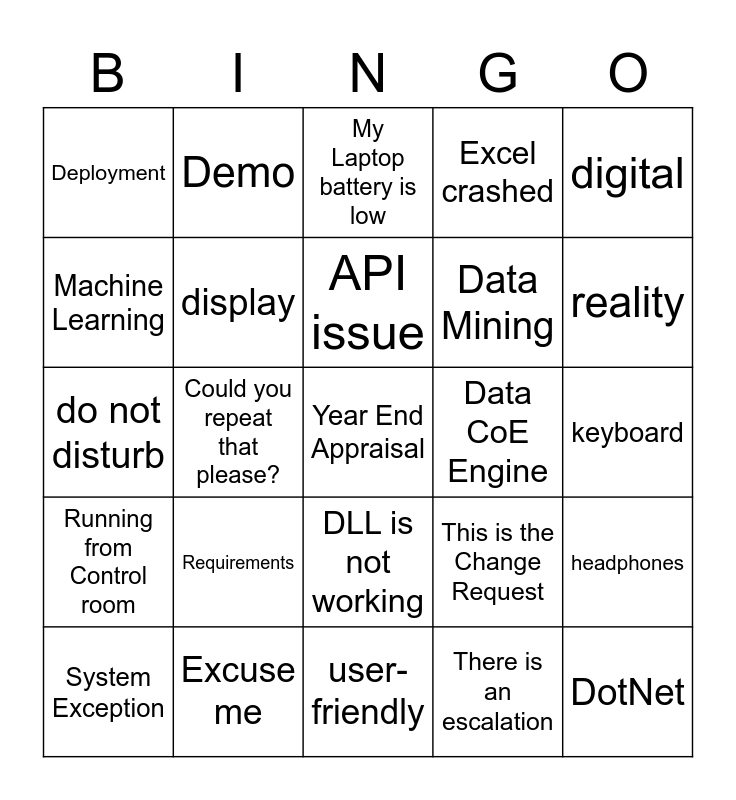 This bingo card has 120 words: This year no appraisal??, Few ppl will get 50% hike!, Are you able to hear me, have you received amazon voucher?, I will b working from Home, I m coming to office tomorrow, Excel crashed, Laptop not working, headphones, Run time error, VM not connecting, Are you able to see my screen?, Network issue!, Power outage, mouse not working, My laptop is not getting started, DLL is not working, My network is too slow, Sorry i was speaking in Mute, Business Exception, System Exception, My Laptop battery is low, Bot failed, MS Teams is very slow, There is a bug in the code, Running from Control room, Excuse me, You are speaking on mute!, That sounds great., My Mic is not working, There is an escalation, Could you repeat that please?, API issue, you are Welcome!, No items in Queue, Resource not available, Development completed, UAT is in Progress, Project status, Data Mining, Sharepoint, Download, Upload, Media Shuttle, Power BI Dashboard, RPA, Agility Platform, Data CoE Engine, Ping me once you are free!, Mark me CC, You have to work on weekend, project kick off call, This is the Change Request, have you completed your one to one?, Stay home stay safe, Info Sec approval, Team Meeting, Status Call, POC, Demo, Project Timeline, Application issue, Charge code😆, Appreciation, Yammer, Machine Learning, Artificial Intelligence, DotNet, Python, Are you on Leave tomorrow!, do not disturb, No Calls Today, Weekend Party, Watsapp, Sanitizer, Printer Jam, Data Mining, One to one, Year End Appraisal, Requirements, Deployment, No More Lock down!, PROD issue, Facebook, Instagram, Road Blocks, user-friendly, scroll, cyber, gadget, monitor, keyboard, cutting-edge, device, virtual, state-of-the-art, up-to-date, digital, data, technology, innovative, Access, Storage, Memory, function, display, touch-screen, computer, upgrade, boot up, desktop, high-specification, profile, application, reality, time-saving, Influence, useful, design and privacy.