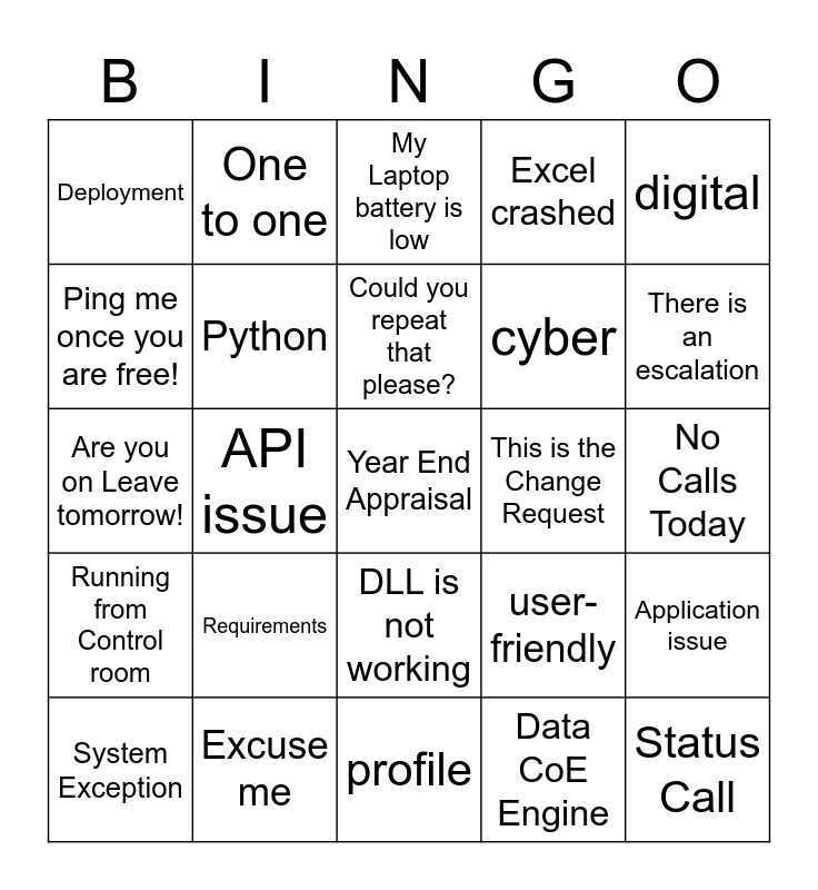 This bingo card has 117 words: This year no appraisal??, Few ppl will get 50% hike!, Are you able to hear me, have you received amazon voucher?, I will b working from Home, I m coming to office tomorrow, Excel crashed, Laptop not working, headphones, Run time error, VM not connecting, Are you able to see my screen?, Network issue!, Power outage, mouse not working, My laptop is not getting started, DLL is not working, My network is too slow, Sorry i was speaking in Mute, Business Exception, System Exception, My Laptop battery is low, Bot failed, MS Teams is very slow, There is a bug in the code, Running from Control room, Excuse me, You are speaking on mute!, That sounds great., My Mic is not working, There is an escalation, Could you repeat that please?, API issue, you are Welcome!, No items in Queue, Resource not available, Development completed, UAT is in Progress, Project status, Sharepoint, Download, Upload, Media Shuttle, Power BI Dashboard, RPA, Agility Platform, Data CoE Engine, Ping me once you are free!, Mark me CC, You have to work on weekend, project kick off call, This is the Change Request, have you completed your one to one?, Stay home stay safe, Info Sec approval, Team Meeting, Status Call, POC, Demo, Project Timeline, Application issue, Charge code😆, Appreciation, Yammer, Machine Learning, Artificial Intelligence, Dot Net, Python, Are you on Leave tomorrow!, do not disturb, No Calls Today, Weekend Party, Sanitizer, Printer Jam, Data Mining, One to one, Year End Appraisal, Requirements, Deployment, No More Lock down!, PROD issue, Facebook, Instagram, Road Blocks, user-friendly, scroll, cyber, gadget, monitor, keyboard, cutting-edge, device, virtual, state-of-the-art, up-to-date, digital, data, technology, innovative, Access, Storage, Memory, function, display, touch-screen, computer, upgrade, boot up, desktop, high-specification, profile, application, reality, time-saving, Influence, design and privacy.