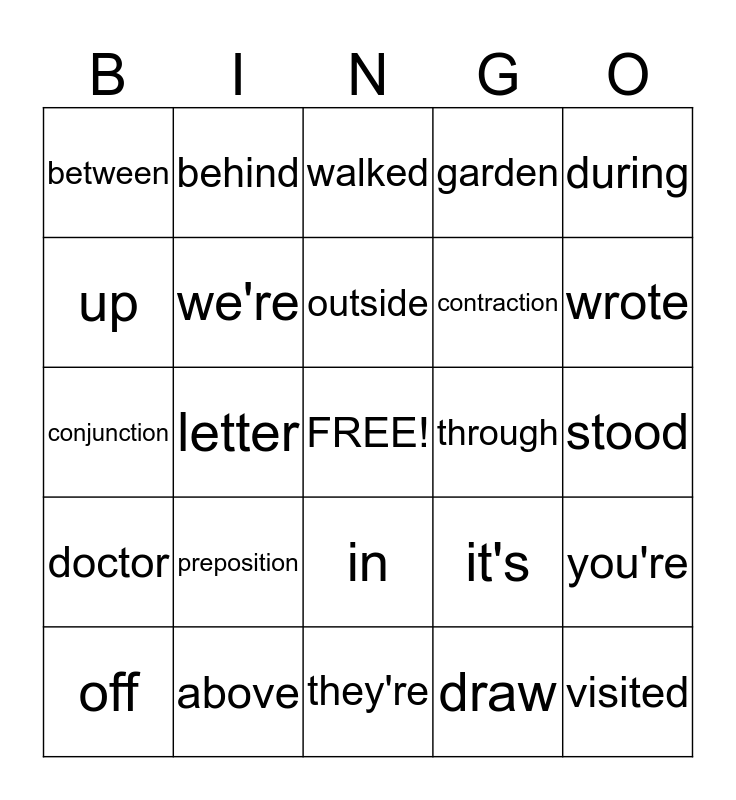 This bingo card has a free space and 24 words: preposition, above, outside, off, during, between, up, behind, through, in, contraction, conjunction, it's, you're, we're, draw, stood, walked, wrote, letter, visited, doctor, garden and they're.