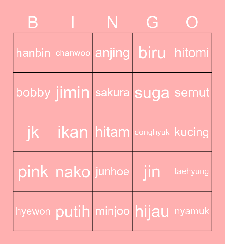 This bingo card has 25 words: nako, minjoo, sakura, hyewon, hitomi, hanbin, bobby, chanwoo, donghyuk, junhoe, suga, jk, jin, taehyung, jimin, nyamuk, kucing, anjing, semut, ikan, hitam, putih, pink, biru and hijau.
