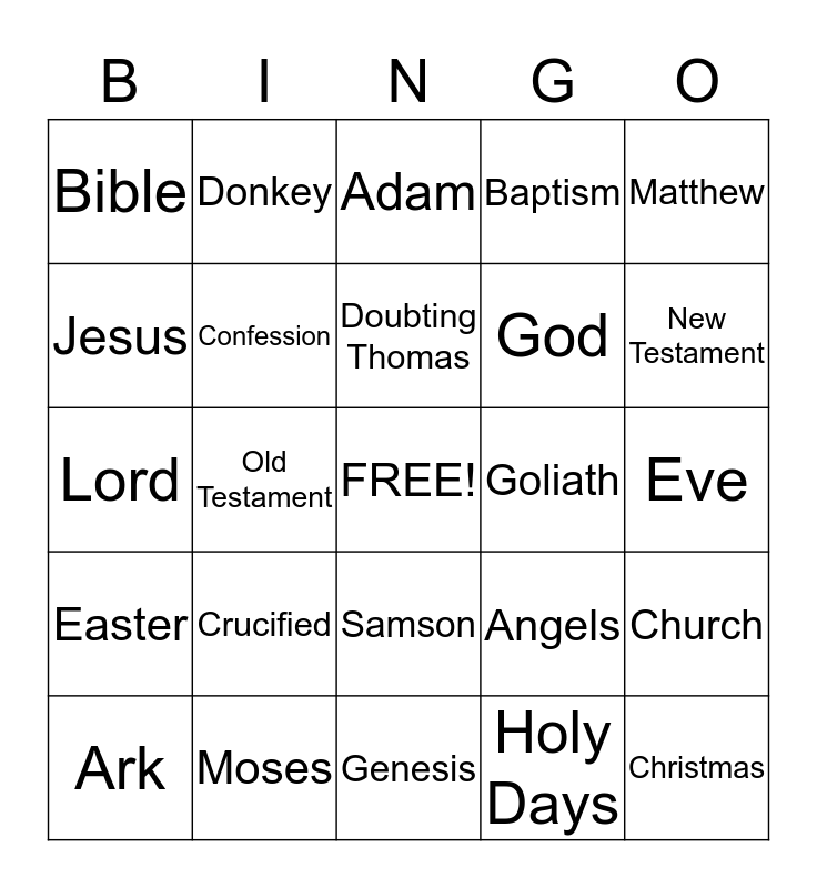 This bingo card has a free space and 24 words: Crucified, Moses, Doubting Thomas, Ark, Matthew, Bible, Jesus, Donkey, Goliath, Samson, God, Lord, Angels, Church, Confession, Holy Days, Eve, Adam, New Testament, Old Testament, Christmas, Easter, Baptism and Genesis.