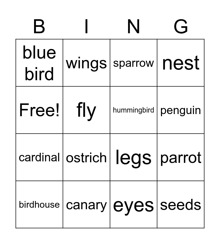 This bingo card has 16 words: canary, parrot, sparrow, blue bird, cardinal, wings, legs, eyes, Free!, fly, birdhouse, nest, ostrich, penguin, hummingbird and seeds.