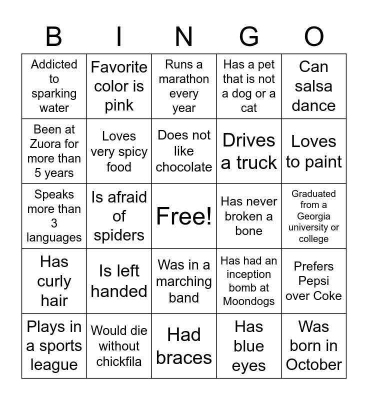 This bingo card has a free space and 24 words: Is left handed, Would die without chickfila, Does not like chocolate, Plays in a sports league, Can salsa dance, Addicted to sparking water, Been at Zuora for more than 5 years, Favorite color is pink, Has never broken a bone, Was in a marching band, Drives a truck, Speaks more than 3 languages, Has had an inception bomb at Moondogs, Prefers Pepsi over Coke, Loves very spicy food, Has blue eyes, Graduated from a Georgia university or college, Runs a marathon every year, Loves to paint, Is afraid of spiders, Was born in October, Has curly hair, Has a pet that is not a dog or a cat and Had braces.