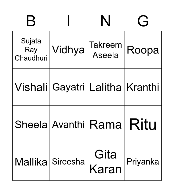 This bingo card has 70 words: Free!, Gita Karan, Jai Karan, Sreelekha, Nitasha Karan, Vasanta, Roopa, Srilakshmi P, Vishali, Swetha Varma, Meenakshi, Shwetha Raj, Sujata Ray Chaudhuri, Takreem Aseela, Vijaya Sree, Ritu, Bhoomika, Sheela, Yasmin, Priyanka, Sireesha, Vijaya lakshmi, Avanthi, Kavitha, Srirupa, Sudha, Rajani, Kavithanjani, Srilakshmi Purna Kumari, Suvarna, Vidhya, Maitreyee, Radhika, Leelavathi, Azmath Unnisa, Jatinder, Uma Bio, Uma math, Nirmala, Gayatri, Venkateswara Reddy, Sainath, Mallika, Neeraja, Sridevi telugu, Lalitha, Sridevi hindi, Rajeshwari, Bharathi, Amandeep, Archana, Shakuntala, Raju, Divya, Usha Madhuri, Ramya, Kranthi, Sai dance, Lorna, Anthony, Rama, Bidisha, Subhashini, Gopanna karate, Venkatesh Scouts, Aravind, Santhosh, Usha admin, Umadevi and Kumara Sai.