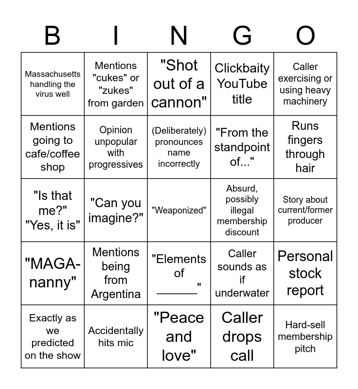This bingo card has a free space and 24 words: Mentions being from Argentina, Accidentally hits mic, (Deliberately) pronounces name incorrectly, Exactly as we predicted on the show, Caller exercising or using heavy machinery, Massachusetts handling the virus well, Mentions going to cafe/coffee shop, Mentions "cukes" or "zukes" from garden, Absurd, possibly illegal membership discount, "Elements of ______", "From the standpoint of...", "Is that me?" "Yes, it is", Caller sounds as if underwater, Personal stock report, Opinion unpopular with progressives, Caller drops call, Story about current/former producer, "Shot out of a cannon", Runs fingers through hair, "Can you imagine?", Hard-sell membership pitch, "MAGA-nanny", Clickbaity YouTube title and "Peace and love".