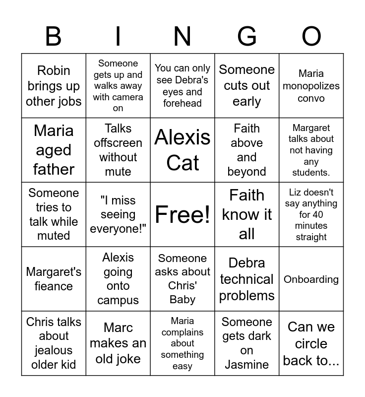 This bingo card has a free space and 24 words: Alexis going onto campus, Marc makes an old joke, Alexis Cat, Chris talks about jealous older kid, Maria monopolizes convo, Robin brings up other jobs, Maria aged father, Someone gets up and walks away with camera on, Faith know it all, Someone asks about Chris' Baby, Faith above and beyond, Someone tries to talk while muted, Debra technical problems, Onboarding, Talks offscreen without mute, Someone gets dark on Jasmine, Liz doesn't say anything for 40 minutes straight, You can only see Debra's eyes and forehead, Margaret talks about not having any students., "I miss seeing everyone!", Can we circle back to..., Margaret's fieance, Someone cuts out early and Maria complains about something easy.