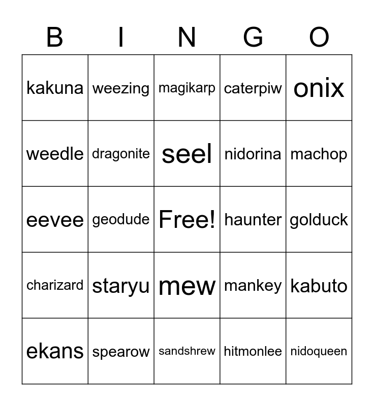 This bingo card has a free space and 54 words: bulbasaur, charizard, squirtle, pikachu, mew, blastoise, caterpiw, metapod, weedle, butterfree, kakuna, raticate, spearow, ekans, arbok, sandshrew, nidoqueen, nidorina, meowth, golduck, mankey, grimer, haunter, onix, cubone, weezing, rhyhorn, rhydon, krabby, hitmonlee, hitmonchan, koffing, jynx, magmar, magikarp, mr. mime, eevee, kabuto, snorlax, dragonite, zapdos, ditto, lapras, goldeen, staryu, horsea, voltorb, muk, seel, geodude, machop, abra, poliwhirl and diglett.