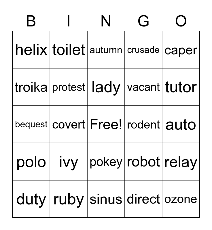 This bingo card has a free space and 27 words: robot, alive, vacant, sinus, troika, autumn, toilet, polo, rodent, relay, bequest, crusade, duty, ruby, tutor, brocade, protest, lady, ivy, helix, auto, direct, covert, ozone, pokey, caper and puny.