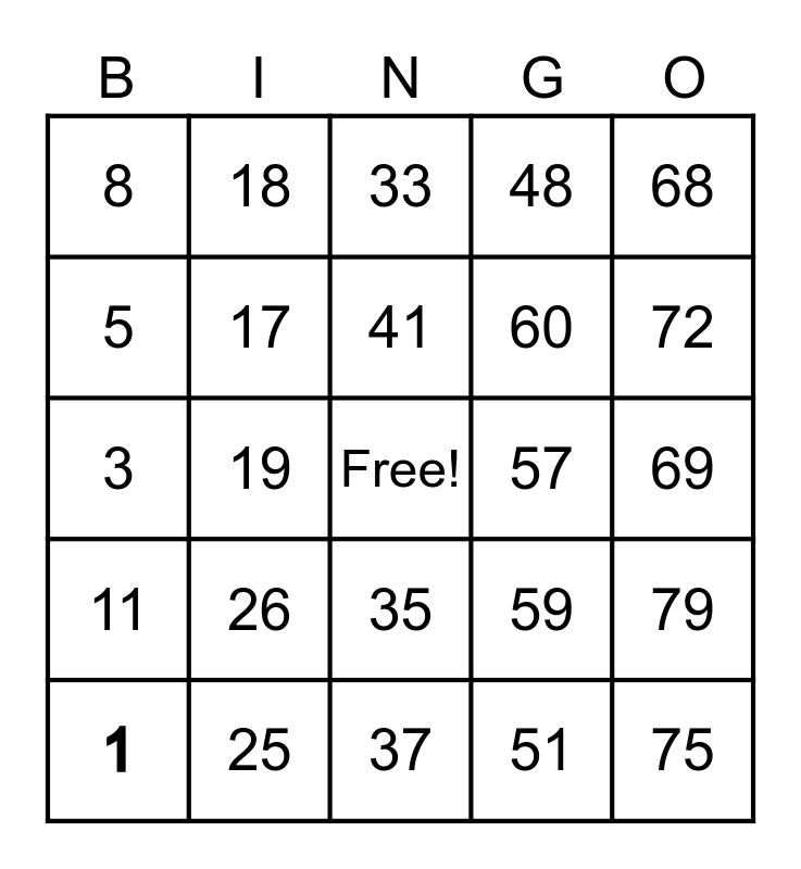 This bingo card has a free space and 24 words: 1, 26, 41, 51, 68, 8, 18, 33, 57, 69, 3, 17, 59, 79, 5, 25, 37, 48, 72, 11, 19, 35, 60 and 75.