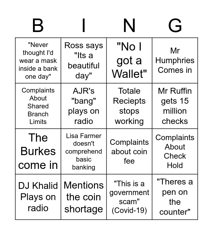 This bingo card has 16 words: Mentions the coin shortage, Complaints About Check Hold, "No I got a Wallet", "Never thought I'd wear a mask inside a bank one day", The Burkes come in, Ross says "Its a beautiful day", Complaints about coin fee, "This is a government scam"(Covid-19), Complaints About Shared Branch Limits, AJR's "bang" plays on radio, DJ Khalid Plays on radio, Mr Humphries Comes in, Lisa Farmer doesn't comprehend basic banking, Mr Ruffin gets 15 million checks, Totale Reciepts stops working and "Theres a pen on the counter".