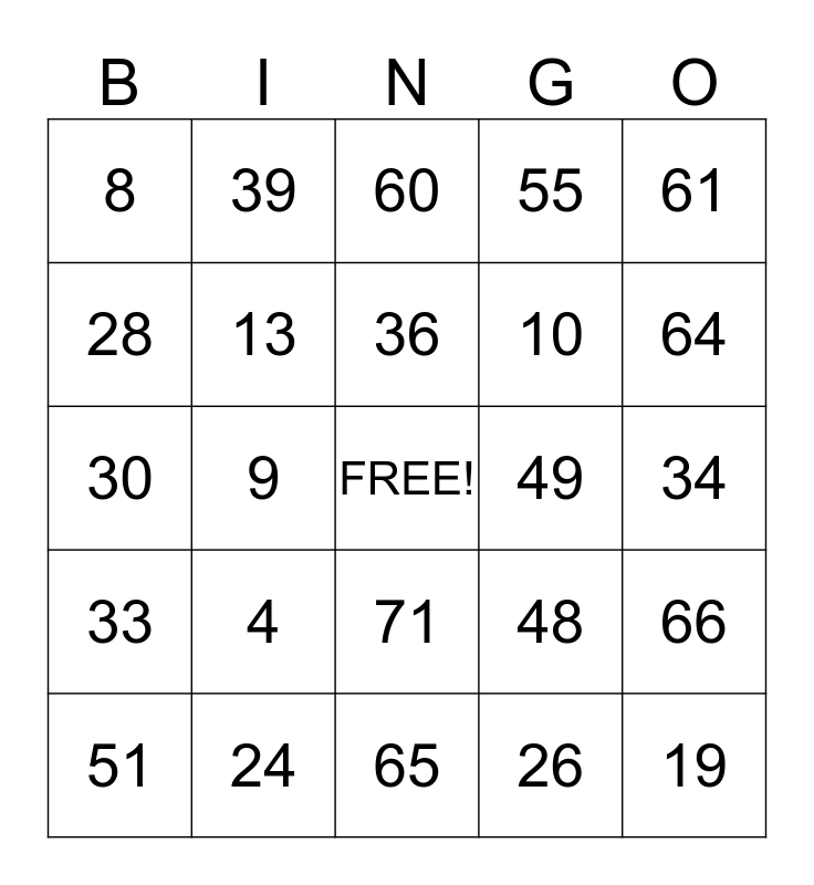 This bingo card has a free space and 24 words: 4, 24, 36, 51, 61, 8, 28, 39, 49, 71, 10, 30, 48, 66, 13, 26, 34, 60, 64, 9, 19, 33, 55 and 65.