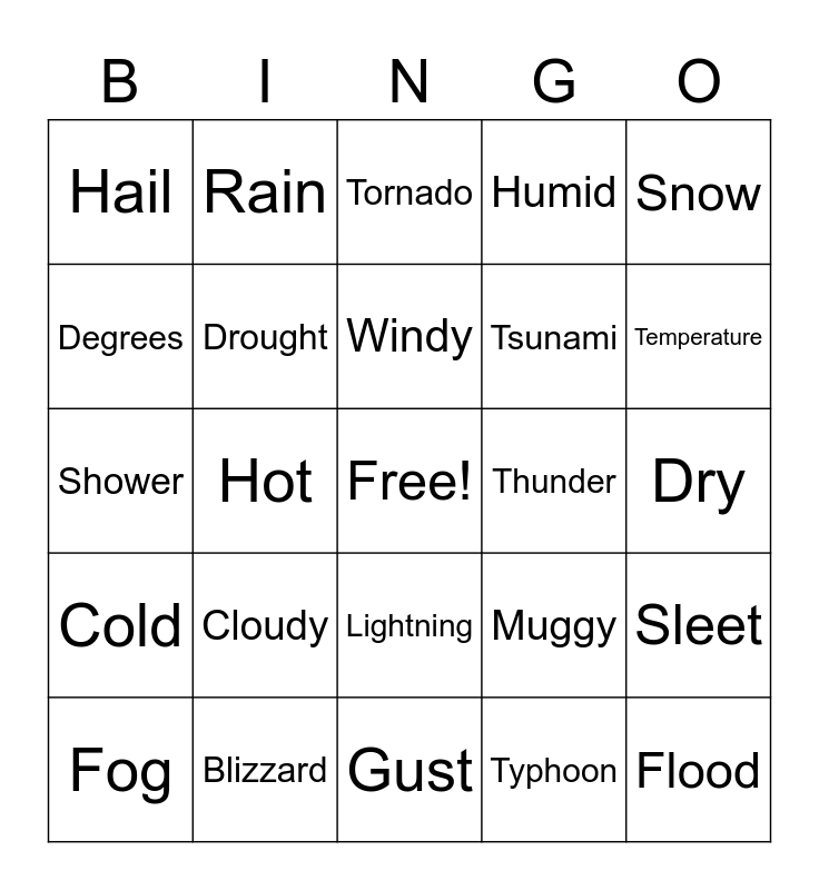 This bingo card has a free space and 24 words: Cloudy, Blizzard, Windy, Fog, Snow, Hail, Degrees, Rain, Thunder, Lightning, Tsunami, Shower, Muggy, Sleet, Drought, Typhoon, Dry, Tornado, Temperature, Hot, Flood, Cold, Humid and Gust.