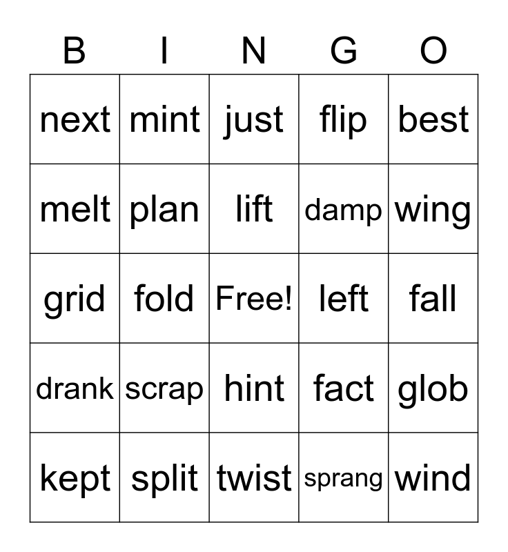 This bingo card has a free space and 24 words: scrap, split, lift, kept, best, next, melt, mint, left, hint, damp, grid, fact, glob, plan, sprang, fall, just, wing, fold, wind, drank, flip and twist.