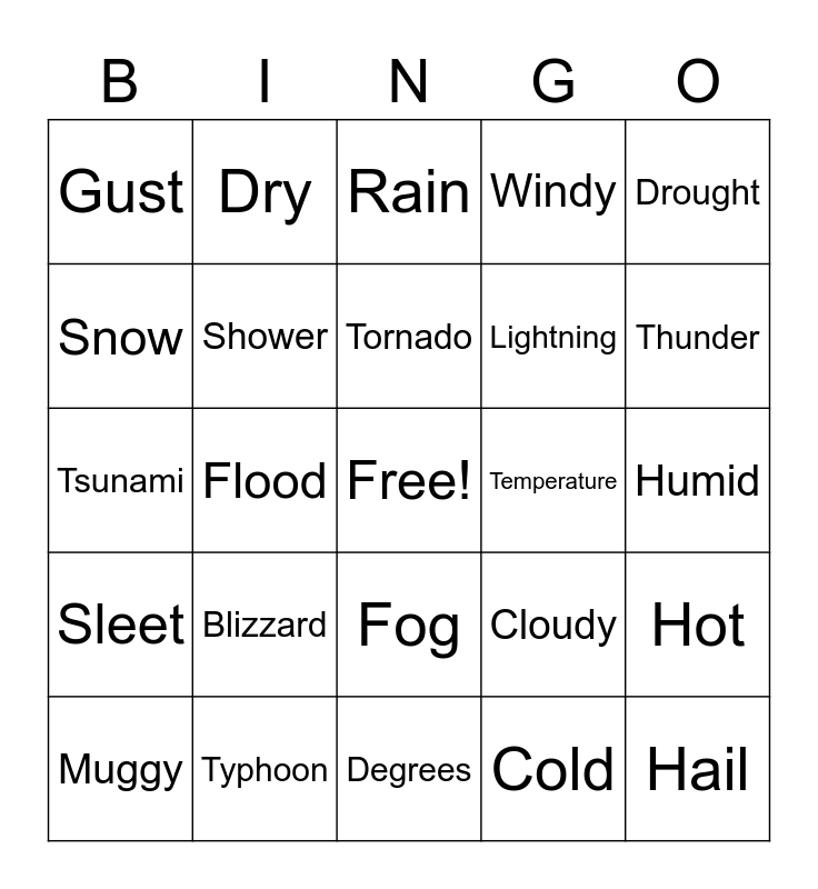 This bingo card has a free space and 24 words: Muggy, Blizzard, Tornado, Cold, Drought, Gust, Dry, Rain, Temperature, Humid, Tsunami, Shower, Cloudy, Hot, Snow, Typhoon, Degrees, Windy, Thunder, Sleet, Flood, Fog, Lightning and Hail.