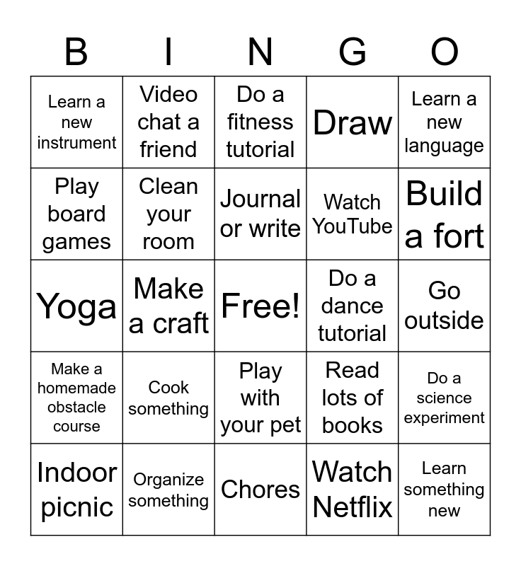 This bingo card has a free space and 24 words: Cook something, Organize something, Journal or write, Indoor picnic, Learn a new language, Learn a new instrument, Play board games, Video chat a friend, Do a dance tutorial, Play with your pet, Watch YouTube, Yoga, Read lots of books, Do a science experiment, Clean your room, Watch Netflix, Go outside, Do a fitness tutorial, Build a fort, Make a craft, Learn something new, Make a homemade obstacle course, Draw and Chores.