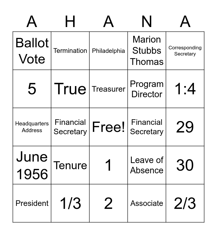 This bingo card has a free space and 53 words: 1938, 2/3, Legacy, Associate, Tenure, Good Standing, Termination, VP, 5, Sponsor, True, False, 30, Leave of Absence, 50%, President, Treasurer, Financial Secretary, Editor, Corresponding Secretary, Financial Secretary, Recording Secretary, Program Director, Ballot Vote, Late Fee, 1/3, Ex-Officio, Odd Years, Even Years, 1:4, National Colors, National Pledge, National Flower, Jack & Jill Hymn, Samuel J. Brown III, Code of Ethics, Marion Stubbs Thomas, 2, Philadelphia, Washington, DC, 1946, Dorothy B. Wright, 29, Sept, Mandatory, 1, Uninterrupted White, Mothers, Headquarters Address, June 1956, Alumni, Foundation and 501(c)(3).