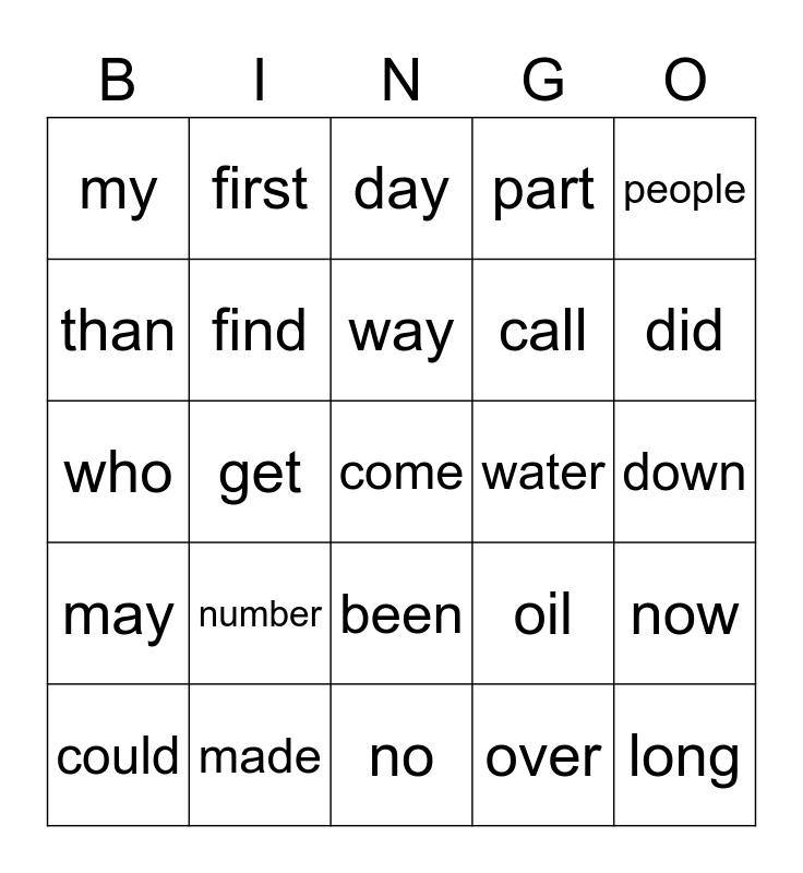 This bingo card has 25 words: number, no, way, could, people, my, than, first, water, been, call, who, oil, now, find, long, down, day, did, get, come, made, may, part and over.