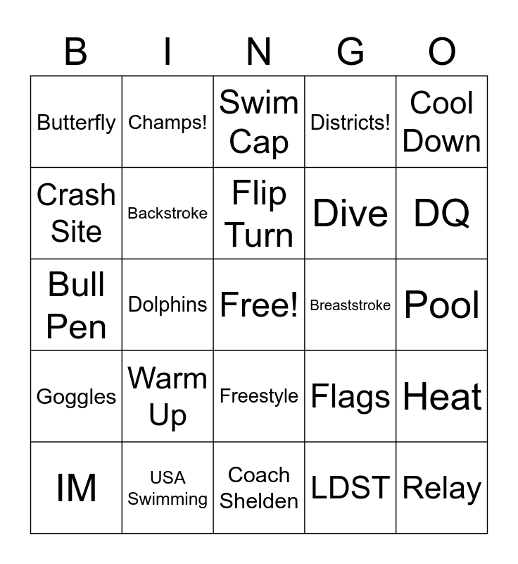 This bingo card has a free space and 24 words: Warm Up, USA Swimming, Flip Turn, IM, Cool Down, Butterfly, Crash Site, Champs!, Breaststroke, Freestyle, Dive, Bull Pen, Flags, Heat, Backstroke, LDST, Pool, Swim Cap, DQ, Dolphins, Relay, Goggles, Districts! and Coach Shelden.