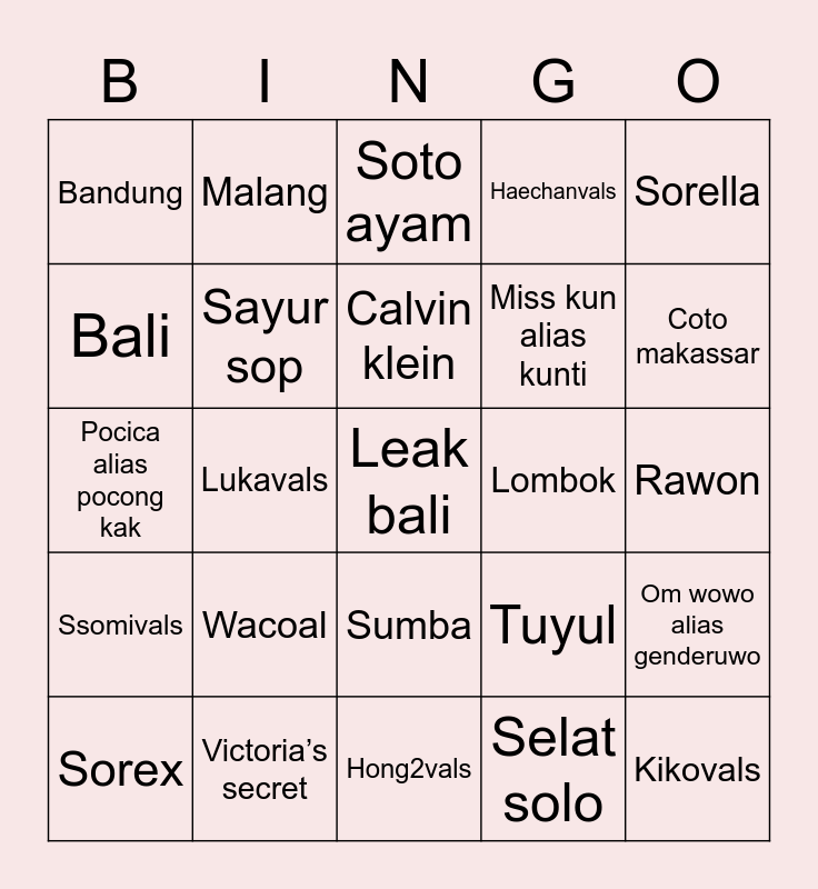 This bingo card has a free space and 24 words: Wacoal, Victoria’s secret, Calvin klein, Sorex, Sorella, Bandung, Bali, Malang, Lombok, Sumba, Miss kun alias kunti, Pocica alias pocong kak, Tuyul, Om wowo alias genderuwo, Sayur sop, Selat solo, Rawon, Soto ayam, Coto makassar, Lukavals, Kikovals, Ssomivals, Haechanvals and Hong2vals.
