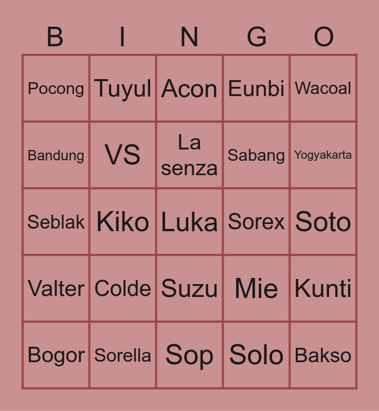 This bingo card has a free space and 24 words: Colde, Sorella, La senza, Bogor, Wacoal, Pocong, Bandung, Tuyul, Sorex, Suzu, Sabang, Seblak, Mie, Kunti, VS, Solo, Soto, Acon, Yogyakarta, Kiko, Bakso, Valter, Eunbi and Sop.