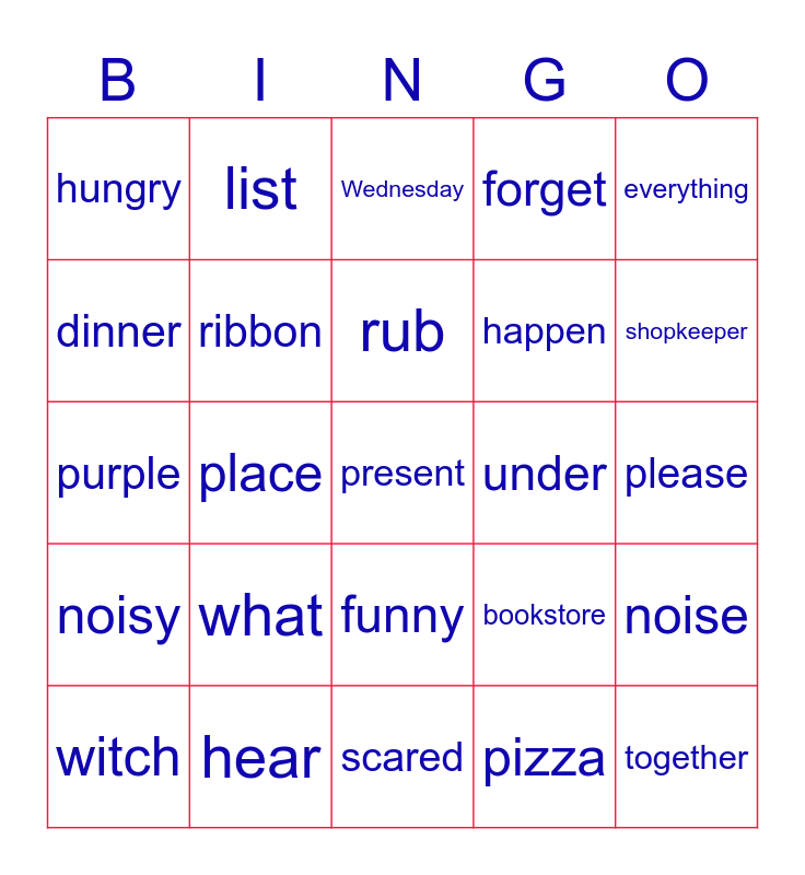 This bingo card has 75 words: Monday, Tuesday, Wednesday, Thursday, Friday, Saturday, Sunday, wash, wipe, live, together, warm, rub, dinner, milk, place, soon, present, have, everything, wrapping, purple, ribbon, list, forget, party, paper, scissors, empty, favorite, feed, cricket, pet shop, bookstore, shopkeeper, happen, small, big, please, pizza, piece, hamster, welcome, sign, window, picnic, witch, hungry, a lot of, magic, laugh, funny, sandwich, soup, careful, carefully, breakfast, lunch, dinner, pet, what, which, should, part, name, under, monster, sure, mouth, noise, noisy, hear, feet, scared and neighbor.