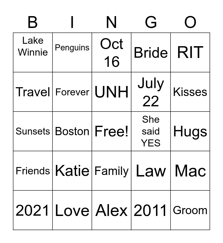 This bingo card has a free space and 24 words: Katie, Love, UNH, 2021, RIT, Lake Winnie, Travel, Penguins, She said YES, Family, July 22, Sunsets, Law, Mac, Forever, 2011, Hugs, Oct 16, Kisses, Boston, Groom, Friends, Bride and Alex.