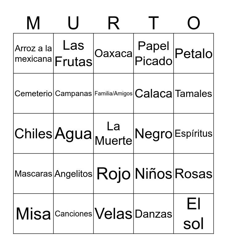 This bingo card has a free space and 24 words: Angelitos, Canciones, Familia/Amigos, Misa, Petalo, Arroz a la mexicana, Cemeterio, Las Frutas, Negro, Rojo, Calaca, Chiles, Niños, Rosas, Campanas, Danzas, Espíritus, Oaxaca, Tamales, Agua, El sol, Mascaras, Papel Picado and Velas.