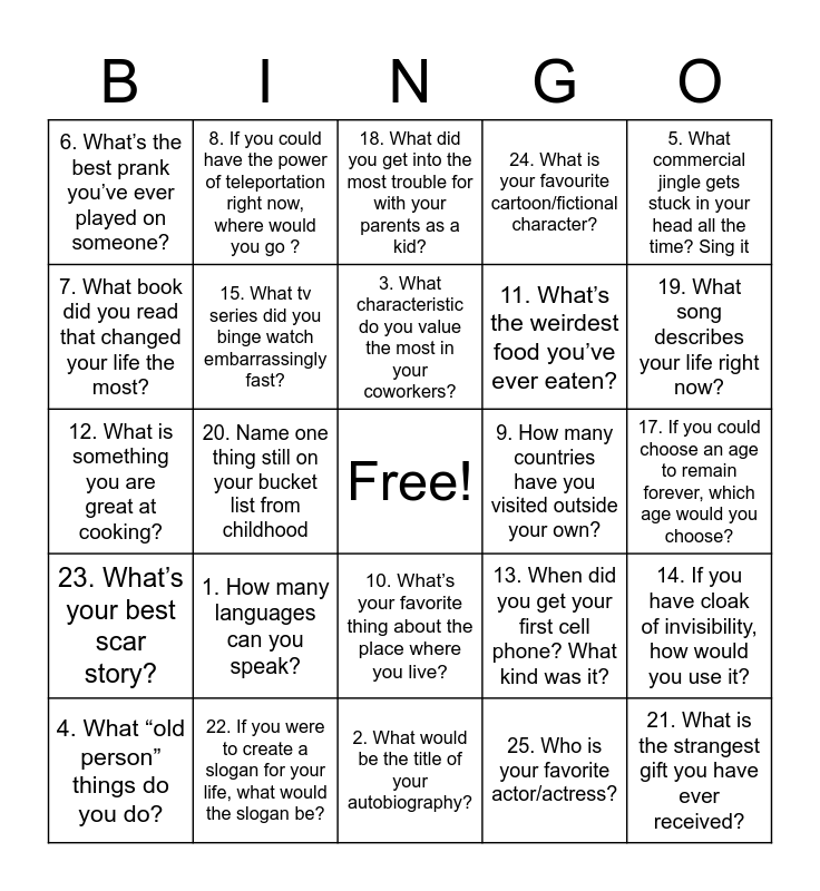 This bingo card has a free space and 25 words: 1. How many languages can you speak?, 2. What would be the title of your autobiography?, 3. What characteristic do you value the most in your coworkers?, 4. What “old person” things do you do?, 5. What commercial jingle gets stuck in your head all the time? Sing it, 6. What’s the best prank you’ve ever played on someone?, 7. What book did you read that changed your life the most?, 8. If you could have the power of teleportation right now, where would you go ?, 9. How many countries have you visited outside your own?, 10. What’s your favorite thing about the place where you live?, 11. What’s the weirdest food you’ve ever eaten?, 12. What is something you are great at cooking?, 13. When did you get your first cell phone? What kind was it?, 14. If you have cloak of invisibility, how would you use it?, 15. What tv series did you binge watch embarrassingly fast?, 16. What movie can you rewatch over and over again?, 17. If you could choose an age to remain forever, which age would you choose?, 18. What did you get into the most trouble for with your parents as a kid?, 19. What song describes your life right now?, 20. Name one thing still on your bucket list from childhood, 21. What is the strangest gift you have ever received?, 22. If you were to create a slogan for your life, what would the slogan be?, 23. What’s your best scar story?, 24. What is your favourite cartoon/fictional character? and 25. Who is your favorite actor/actress?.