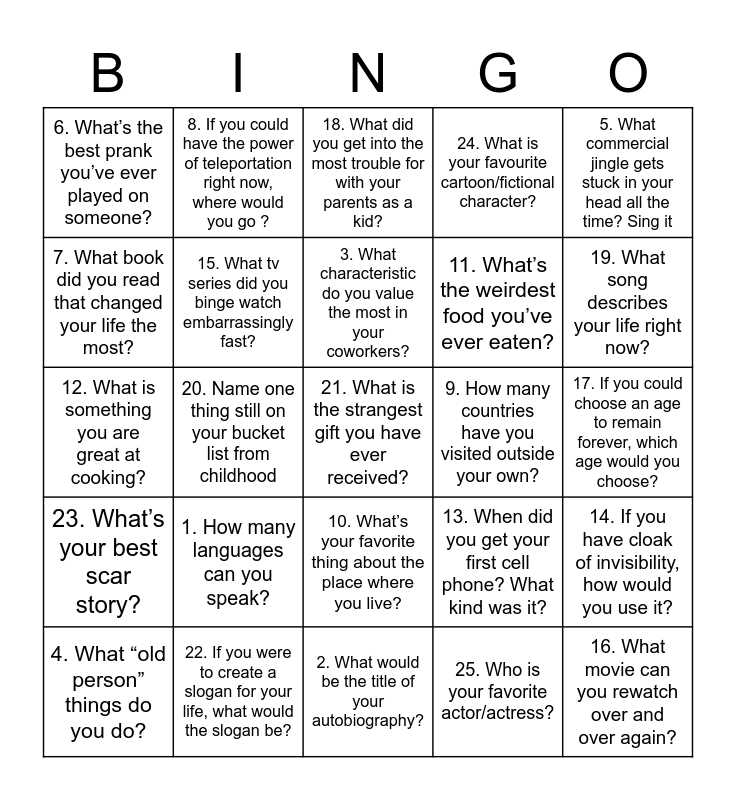 This bingo card has 25 words: 1. How many languages can you speak?, 2. What would be the title of your autobiography?, 3. What characteristic do you value the most in your coworkers?, 4. What “old person” things do you do?, 5. What commercial jingle gets stuck in your head all the time? Sing it, 6. What’s the best prank you’ve ever played on someone?, 7. What book did you read that changed your life the most?, 8. If you could have the power of teleportation right now, where would you go ?, 9. How many countries have you visited outside your own?, 10. What’s your favorite thing about the place where you live?, 11. What’s the weirdest food you’ve ever eaten?, 12. What is something you are great at cooking?, 13. When did you get your first cell phone? What kind was it?, 14. If you have cloak of invisibility, how would you use it?, 15. What tv series did you binge watch embarrassingly fast?, 16. What movie can you rewatch over and over again?, 17. If you could choose an age to remain forever, which age would you choose?, 18. What did you get into the most trouble for with your parents as a kid?, 19. What song describes your life right now?, 20. Name one thing still on your bucket list from childhood, 21. What is the strangest gift you have ever received?, 22. If you were to create a slogan for your life, what would the slogan be?, 23. What’s your best scar story?, 24. What is your favourite cartoon/fictional character? and 25. Who is your favorite actor/actress?.