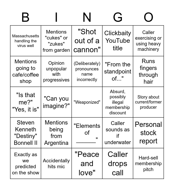 This bingo card has a free space and 24 words: Mentions being from Argentina, Accidentally hits mic, (Deliberately) pronounces name incorrectly, Exactly as we predicted on the show, Caller exercising or using heavy machinery, Massachusetts handling the virus well, Mentions going to cafe/coffee shop, Mentions "cukes" or "zukes" from garden, Absurd, possibly illegal membership discount, "Elements of ______", "From the standpoint of...", "Is that me?" "Yes, it is", Caller sounds as if underwater, Personal stock report, Opinion unpopular with progressives, Caller drops call, Story about current/former producer, "Shot out of a cannon", Runs fingers through hair, "Can you imagine?", Hard-sell membership pitch, Steven Kenneth "Destiny" Bonnell II, Clickbaity YouTube title and "Peace and love".