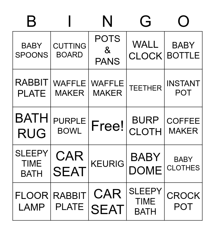 ⚠ This card has duplicate items: WALL CLOCK (2), CROCK POT (2), HAND MIXER (2), FLOOR LAMP (2), INSTANT POT (2), BATH RUG (2), CUTTING BOARD (2), KITCHEN TOWELS (2), WAFFLE MAKER (2), BATH TOWEL (2), KEURIG (2), MIXING BOWL (2), COFFEE MAKER (2), BABY BOTTLE (2), BURP CLOTH (2), RABBIT PLATE (2), PURPLE BOWL (2), BABY SPOONS (2), STROLLER (2), CAR SEAT (2), TEETHER (2), BABY DOME (2), SLEEPY TIME BATH (2), AVEENO LOTION (2), BABY MONITOR (2), BABY BLANKET (2), VACUUM (2), KNIVES (2), BABY CLOTHES (2), CANISTER (2), POTS & PANS (2), COFFEE MUGS (2), WINE GLASSES (2), PANINI MAKER (2)